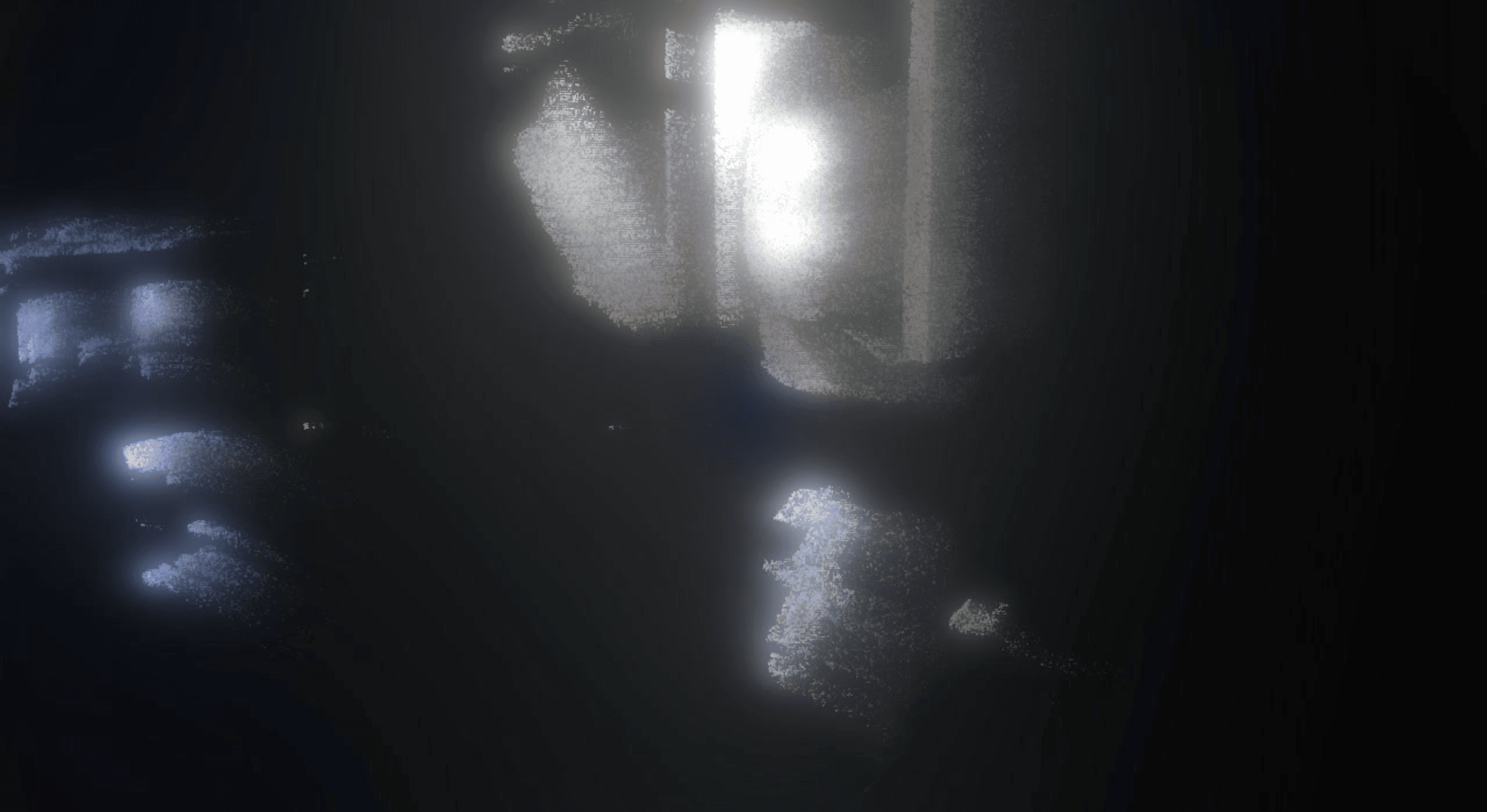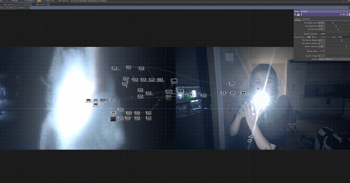 Interplanes captures trace and movement. It uses a combination of particles GPU and web camera to form point clouds. It also applies GyroOSC to affect the 3D camera and wind turbulence alongside RMS power from music for wider particles and bloom.